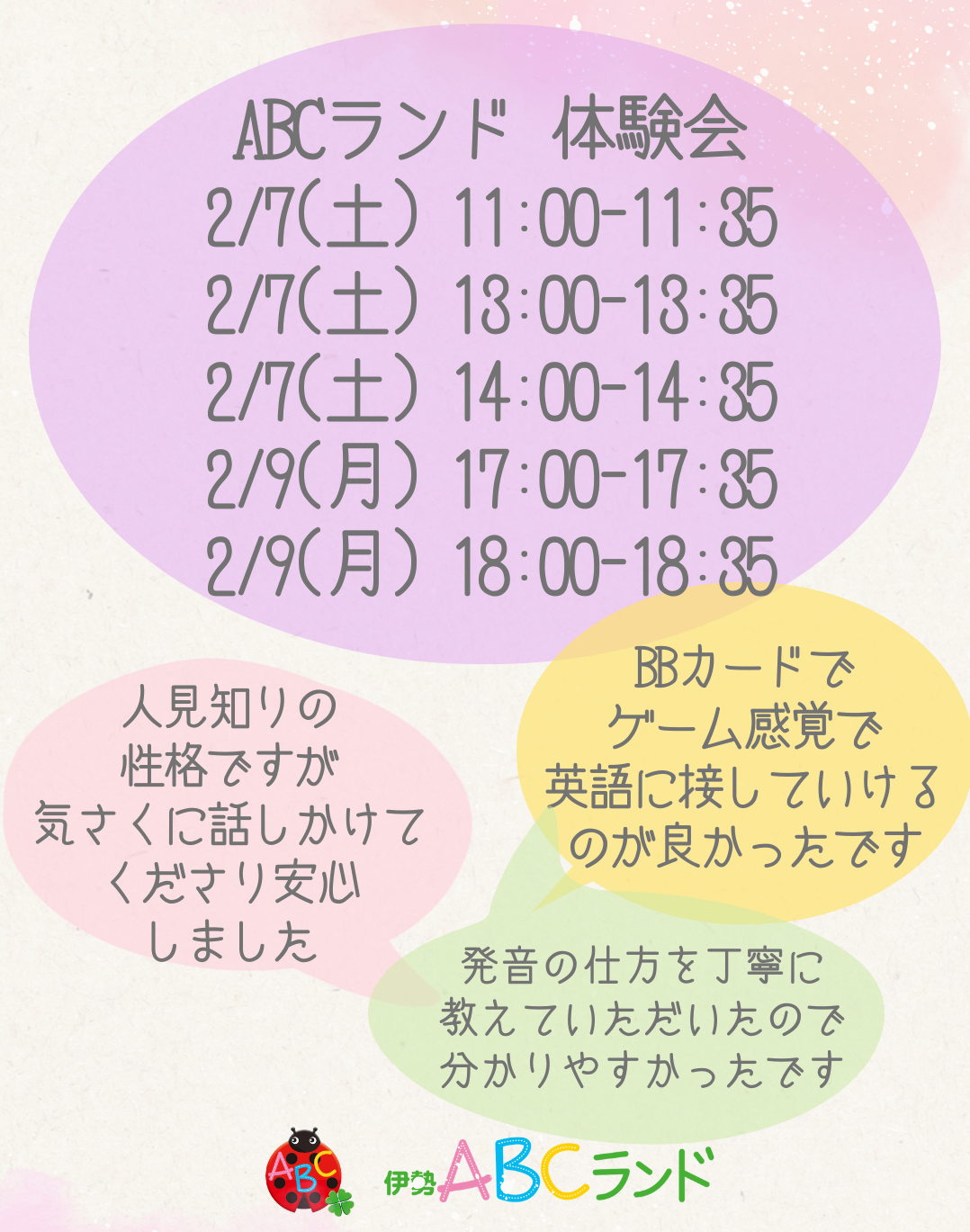 幼児・小学生からカードゲームで遊びながら英語の発音を育て 英語発音を大切に育てリスニング力が自然にアップ♪ 1月にご予約いただけるのは フォニックス(日本語のあいうえおの様な読み方)や さらには中学3年生までの英文法を 5ヶ月間でフォニックス基礎を学び フォニックスで読む力をつけつつ ABCランドは年間レッスン数が多く、レッスン時間も長め! レッスン時間も長い♪ 長いレッスン時間なのにあっという間、「もう終わり!?」って声が出ます!